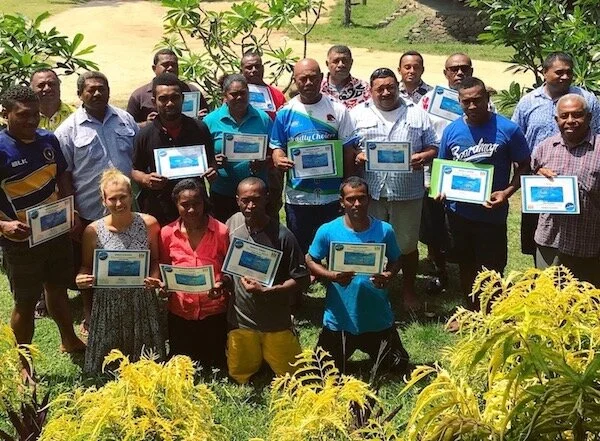 Newly appointed Fish Wardens after completing training conducted by the Ministry of Fisheries on Kaibu Island. Photo by Vatuvara Private Islands.